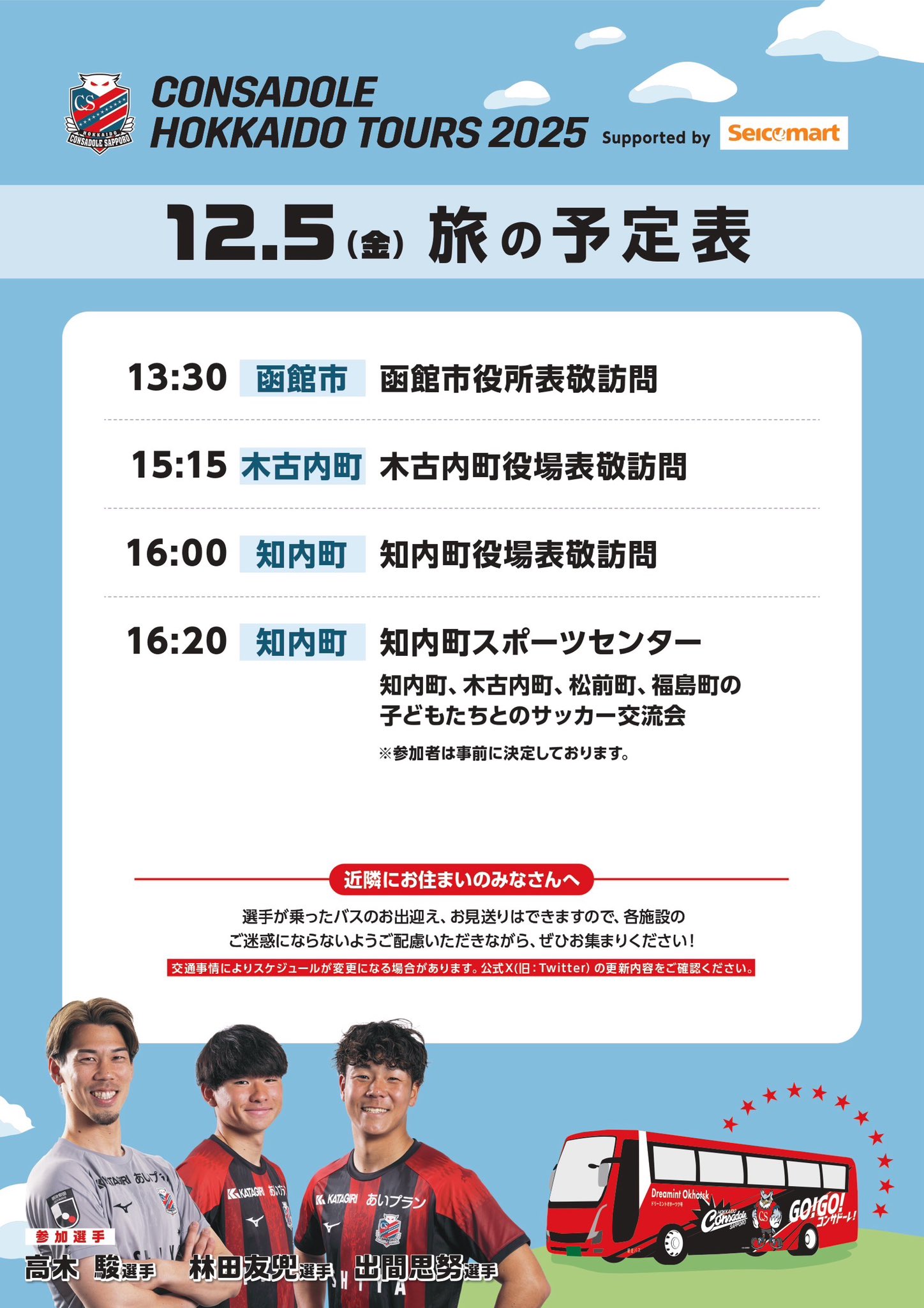 宮の沢のクラブハウスから #高木駿 選手、#林田友兜 選手、#出間思努 選手が函館市・木古内町・知内町方面へ向けて出発しました✨ 3選手からのご挨拶と、本日の行程表です⏰