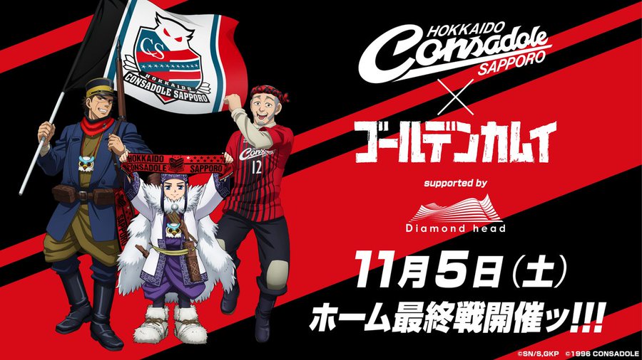 Twitterで<TVアニメ『ゴールデンカムイ』公式>さんがツイートしてます。 コピーです。 本年もTVアニメ『ゴールデンカムイ』×北海道コンサドーレ札幌 supported by Diamond head コラボレーション企画 開催決定! コラボレーション企画の詳細は順次発表していきますので、是非チェックしてください! https://kamuy-anime.com/news/index04610000.html 添付画像です。 https://pbs.twimg.com/media/Fa-vfGVakAEY8sE?format=jpg&name=900x900