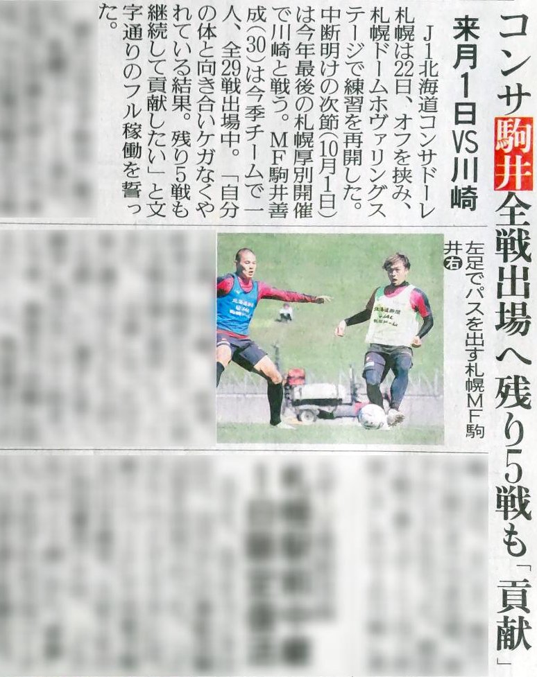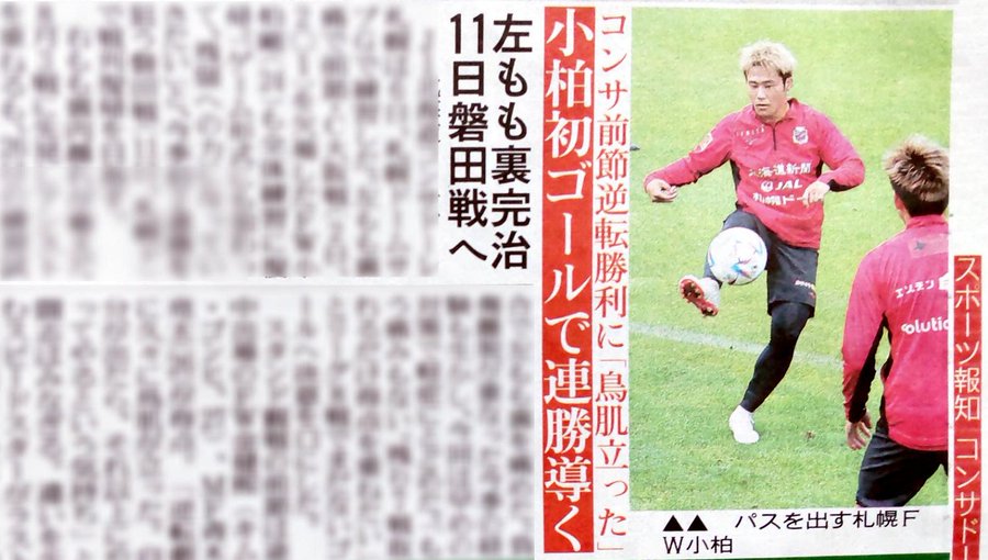 おはようございます。 今日は、サポーターズデー。 宮の沢は大変な人でにぎわうのでしょうね。 朝刊コンサ記事からです。 が、期待外れでした。記事ありません。 で、<スポーツ報知>さんが練習試合関係のツイートをしてますので、その紹介で。 ツイートです。 コンサドーレは 札幌大 (4―0)、 東海大札幌大 (5―1)と練習試合。 代表ウィークの中断期間に組めた貴重な実戦の場で、出番増を狙う選手たちも収穫と課題を得ていました。 チーム内競争も活性化させながら残り5戦に向かいます! 添付写真は4枚。 順に、中島大嘉 田中宏武 中村桐耶 ゴンヒ ゴニ のようです。 https://pbs.twimg.com/media/FdaZOsOWYAIZwVd?format=jpg&name=4096x4096 https://pbs.twimg.com/media/FdaZR86UcAECbb7?format=jpg&name=4096x4096 https://pbs.twimg.com/media/FdaZUs6UUAACola?format=jpg&name=4096x4096 https://pbs.twimg.com/media/FdaZcKeVsAAkCIN?format=jpg&name=4096x4096 今朝の「朝刊コンサ」でした。