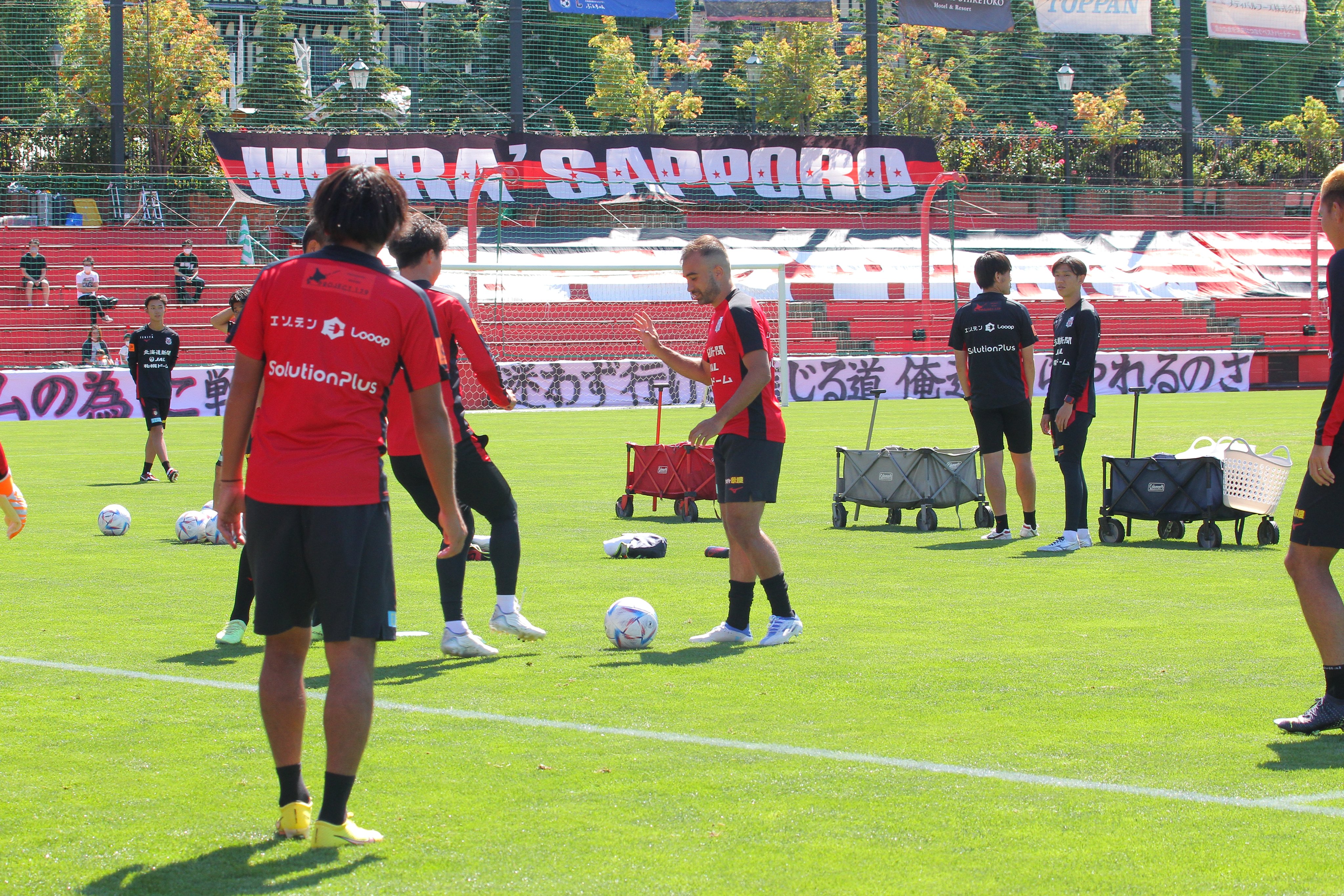 思ったとおりでした。 芝の一部補修のためです。 Twitterでツイートしてます。 こちら。 宮の沢白い恋人サッカー場の一部芝の補修の為、チームは29日(木)まで札幌ドームサブグラウンドでトレーニングを行います👊 添付写真です。今日も秋晴れです。見学者がかなり来てるようですね。 https://pbs.twimg.com/media/FdoCag9acAAaoki?format=jpg&name=medium