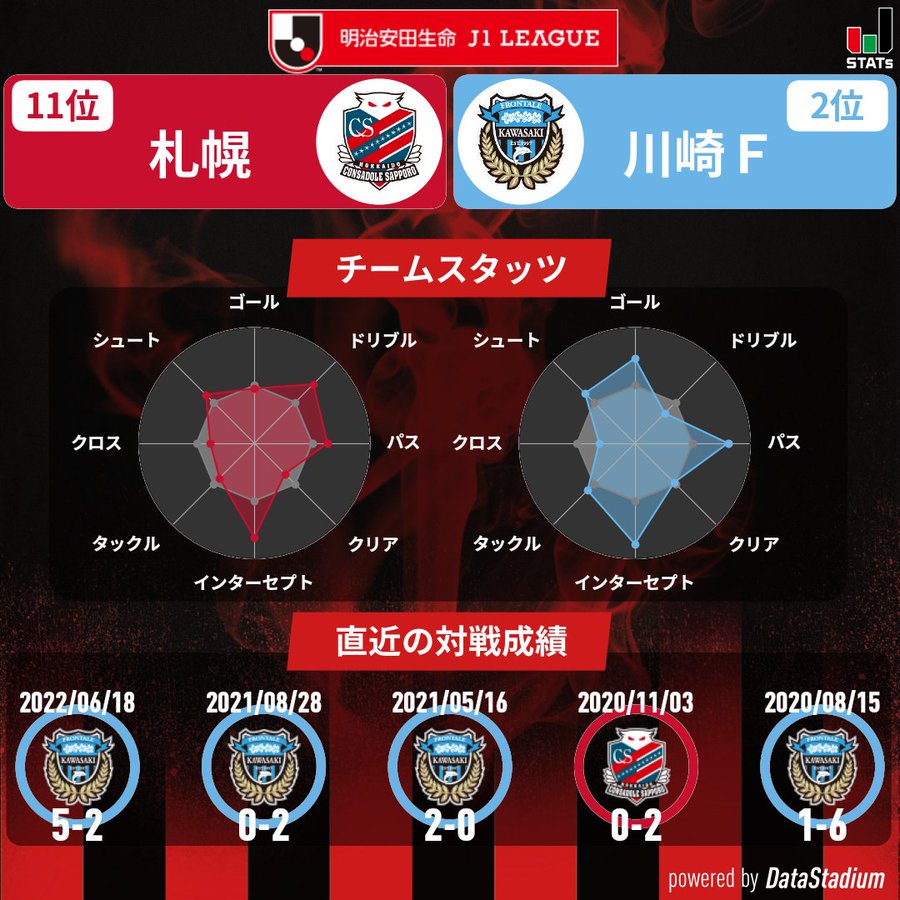 Jリーグ公式HPに掲載されています。 タイトル「札幌は直近3試合で2勝1分。今節は2位・川崎Fに挑戦」 貼ります。 https://www.jleague.jp/match/j1/2022/100101/preview/#preview/