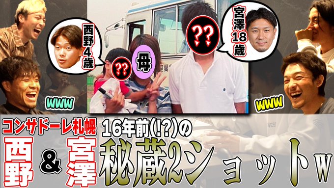 大伍のツイートです。 本日の動画です! 衝撃の事実!!!! 【衝撃】コンサ西野と宮澤が16年前に2ショットを撮っていた話w 添付画像です。 https://pbs.twimg.com/media/FtBss0KakAA2aEJ?format=jpg&name=small 動画です。 https://youtu.be/r5ZcTlffcos?t=3 <衝撃の事実>は最後の最後です(苦笑)。