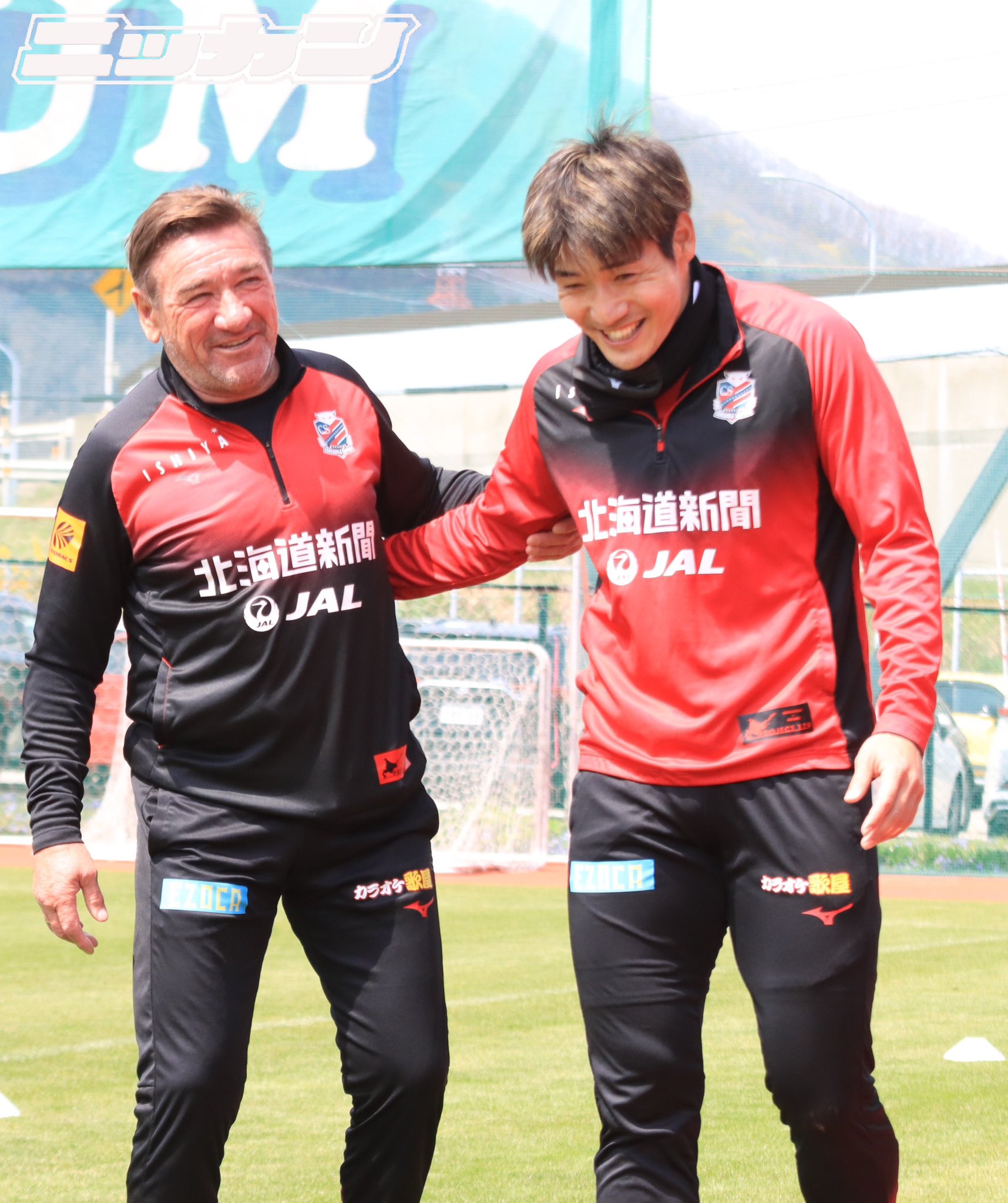 ★株主総会関係ツイート 北海道コンサドーレ札幌を運営する株式会社コンサドーレの株主総会が行われました。22年度売上高は36億534万円(前期比106•3%)、純損失は7億1742万8000円で5期連続赤字となりました。 クラウドファンディングで集まった支援金の計上は23年度です。 ★ツイートの答え 正解は「ミシャ監督を隠した」でした! 報道陣が後方から近づくミシャ監督(岡村大八 選手の左腰から腕だけ見えます)にカメラを向けたことを察知して、両手を広げて目隠し!上手に隠せています😂ミシャ監督が笑っていました。 https://pbs.twimg.com/media/FuyJYrJaEAEnp5F?format=jpg&name=large https://pbs.twimg.com/media/FuyJYqFaMAEVI7y?format=jpg&name=large