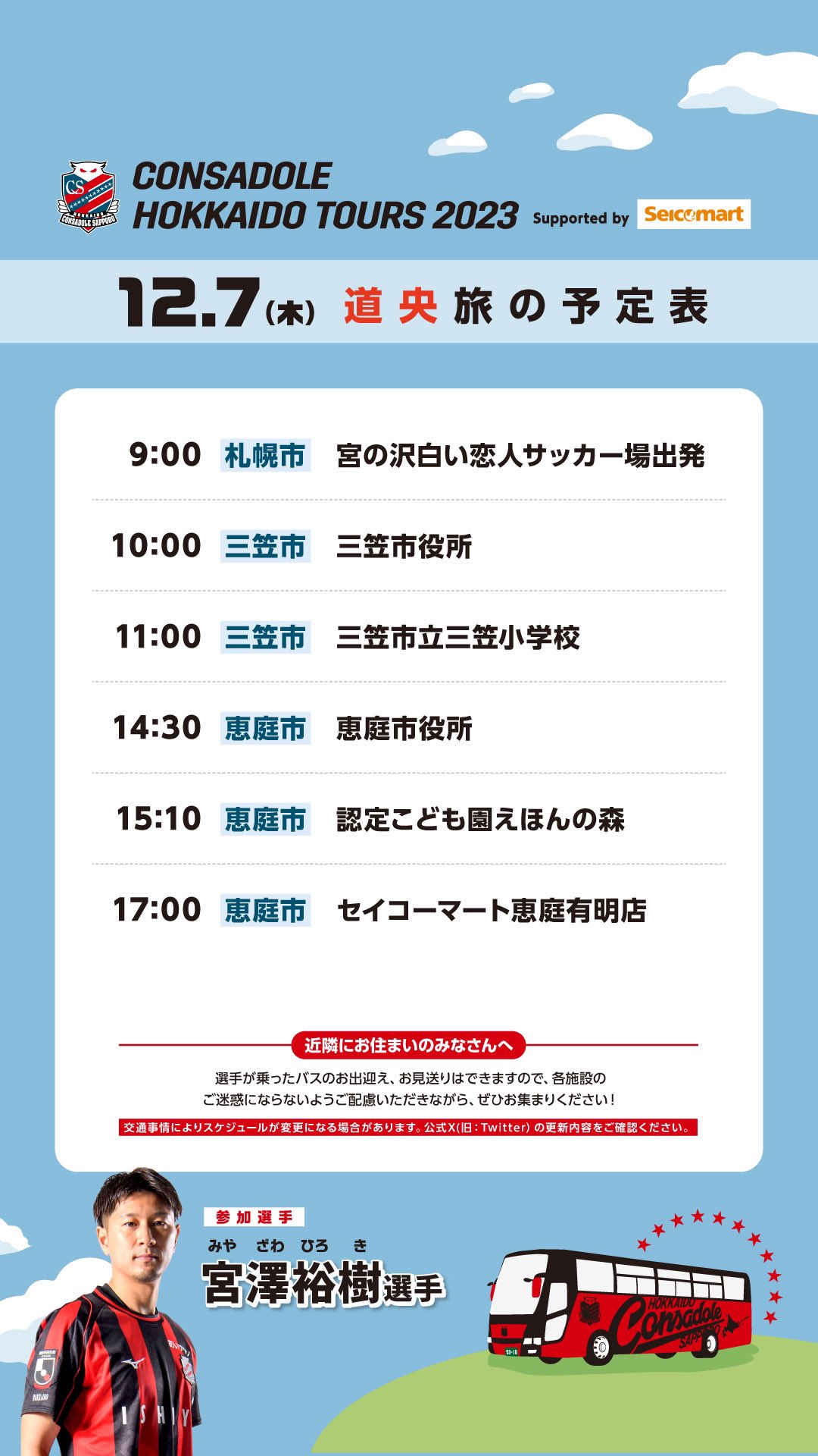 公式さんのポストです。 CONSADOLE HOKKAIDO TOURS supported by seicomart 🌈道央編2日目🚌 宮の沢から 宮澤裕樹 選手を乗せたバスが出発しました✨ 本日の行程表です⏰ 詳細👇 https://consadole-sapporo.jp/news/2023/12/9574/ 写真2枚。 https://pbs.twimg.com/media/GAtCQrTacAAg-x4?format=jpg&name=large https://pbs.twimg.com/media/GAtCQrPbIAA_Lqr?format=jpg&name=large 昨日の菅野同様、丸々1日なんですね。 最後は恵庭で1日店長? <コンサラボ|UHBコンサドーレ取材班>さんのポストです。 【CONSADOLE HOKKAIDO TOURS supported by seicomart 🚌】 宮澤裕樹 キャプテンが 最初に訪れたのは 三笠市役所 職員の方で高校時代、宮澤選手と 対戦された方が! 当時室蘭大谷高校時代の宮澤選手に オーバーヘッドでゴールを決められたそう。 写真3枚。 https://pbs.twimg.com/media/GAtchJLboAAHicX?format=jpg&name=large https://pbs.twimg.com/media/GAtchJHacAA1qlb?format=jpg&name=large https://pbs.twimg.com/media/GAtchJHbsAA2jlK?format=jpg&name=large さらに公式さんのポスト。 🏛三笠市役所 🏫三笠市立三笠小学校 に訪問✨✨ 宮澤裕樹 選手の粋な計らいで、生徒達に配るステッカー全てにサインをしました✏️ また子どもからの質問に応える時は、目線の高さを合わせる優しいキャプテン☺️ 写真4枚。 https://pbs.twimg.com/media/GAtvKlxacAAba0K?format=jpg&name=large https://pbs.twimg.com/media/GAtvKlubEAAh2lZ?format=jpg&name=large https://pbs.twimg.com/media/GAtvKl1aYAAu-ym?format=jpg&name=large https://pbs.twimg.com/media/GAtvKlxbEAAz6yQ?format=jpg&name=large 昨日の菅野も今日の宮沢も、<愛にあふれる訪問>ですね。