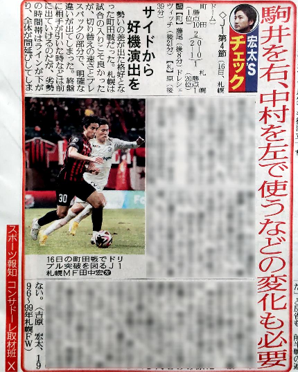 日刊スポーツ(文責は保坂さん)が配信した記事です。 配信タイトル 「【札幌】DF岡村大八「尻たたかれて火ついた」マンツーマン守備再確認、今季初勝利へ原点回帰」 貼ります。 https://news.yahoo.co.jp/articles/c91d18d6e1ef34b057f23e3390c33badb36ea83f