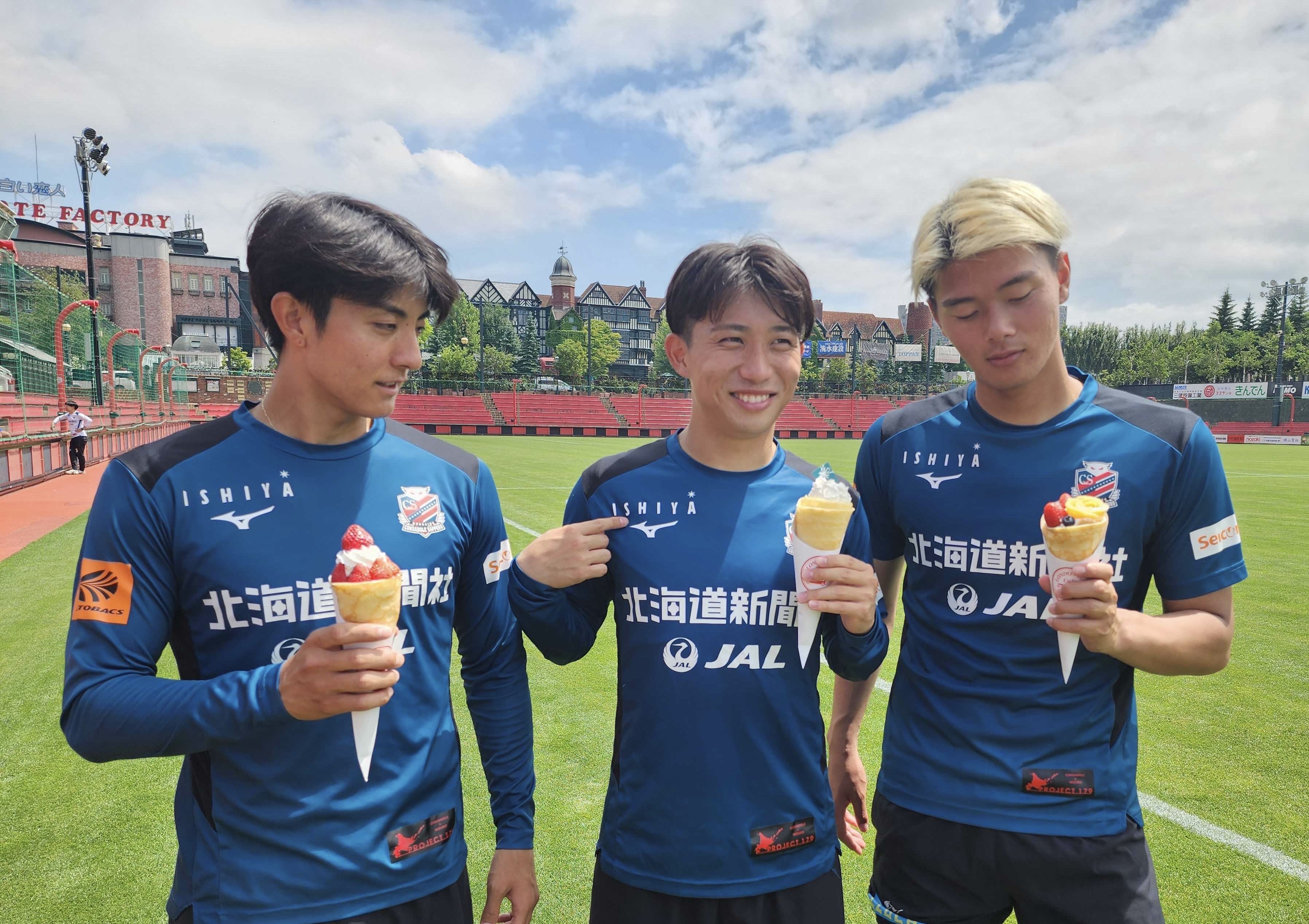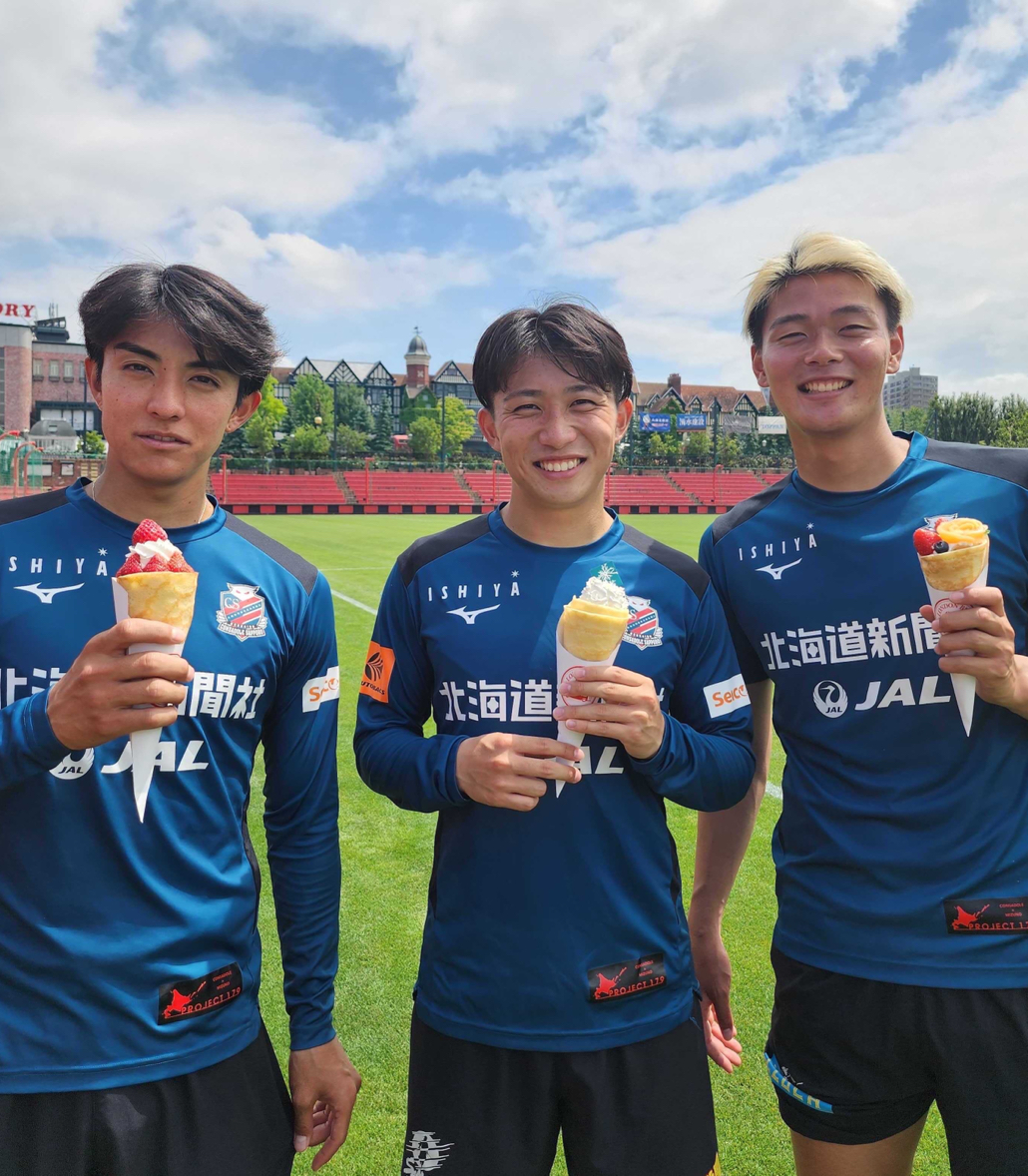 投稿順に。 北海道コンサドーレ札幌 の選手の皆様に、白い恋人パークで販売しているクレープをお召し上がりいただきました😋✨ 甘いクレープで糖分を補給して 練習・試合 頑張ってください🎵 https://pbs.twimg.com/media/GTS7VU8aYAAqbbo?format=jpg&name=medium https://pbs.twimg.com/media/GTS7V3VaYAIIVyd?format=jpg&name=medium 撮影裏話① スポーツ選手だから甘いものは控えているかも…と心配していましたが、クレープをお持ちしたらみんなとっても喜んでくれました🥰 が、 西野奨太 選手だけは「これ食べたらお化け屋敷の撮影連れてかれるとかないですよね…?」とちょっと警戒していました😂 撮影裏話② 北海道コンサドーレ札幌 に今年加入した 原康介 選手✨ 「クレープはもっと顔の近くに!」 「ISHIYAのロゴが隠れないように!」 と、先輩選手たちに撮影の極意を教わっていました🤭 https://pbs.twimg.com/media/GTYEht5agAA3S9H?format=jpg&name=4096x4096