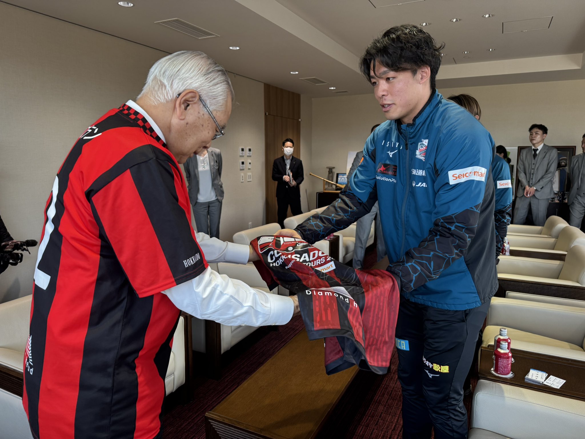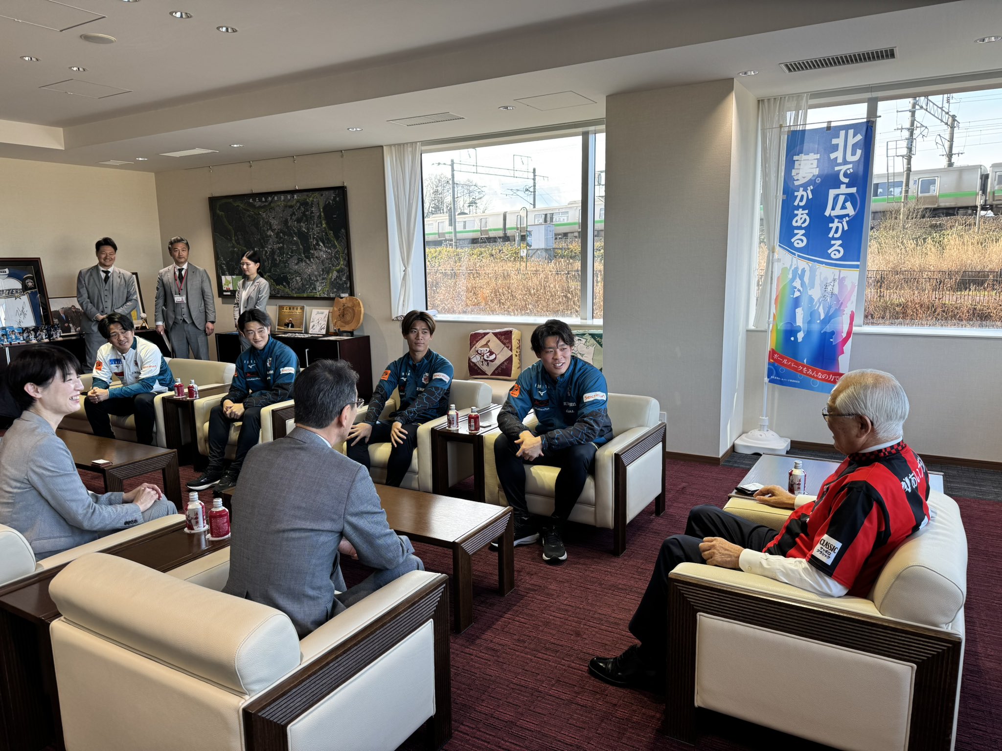 北広島市役所で職員の皆さま、市民の皆さまと交流し、北広島市長 上野正三様にユニフォームを贈呈させていただきました。