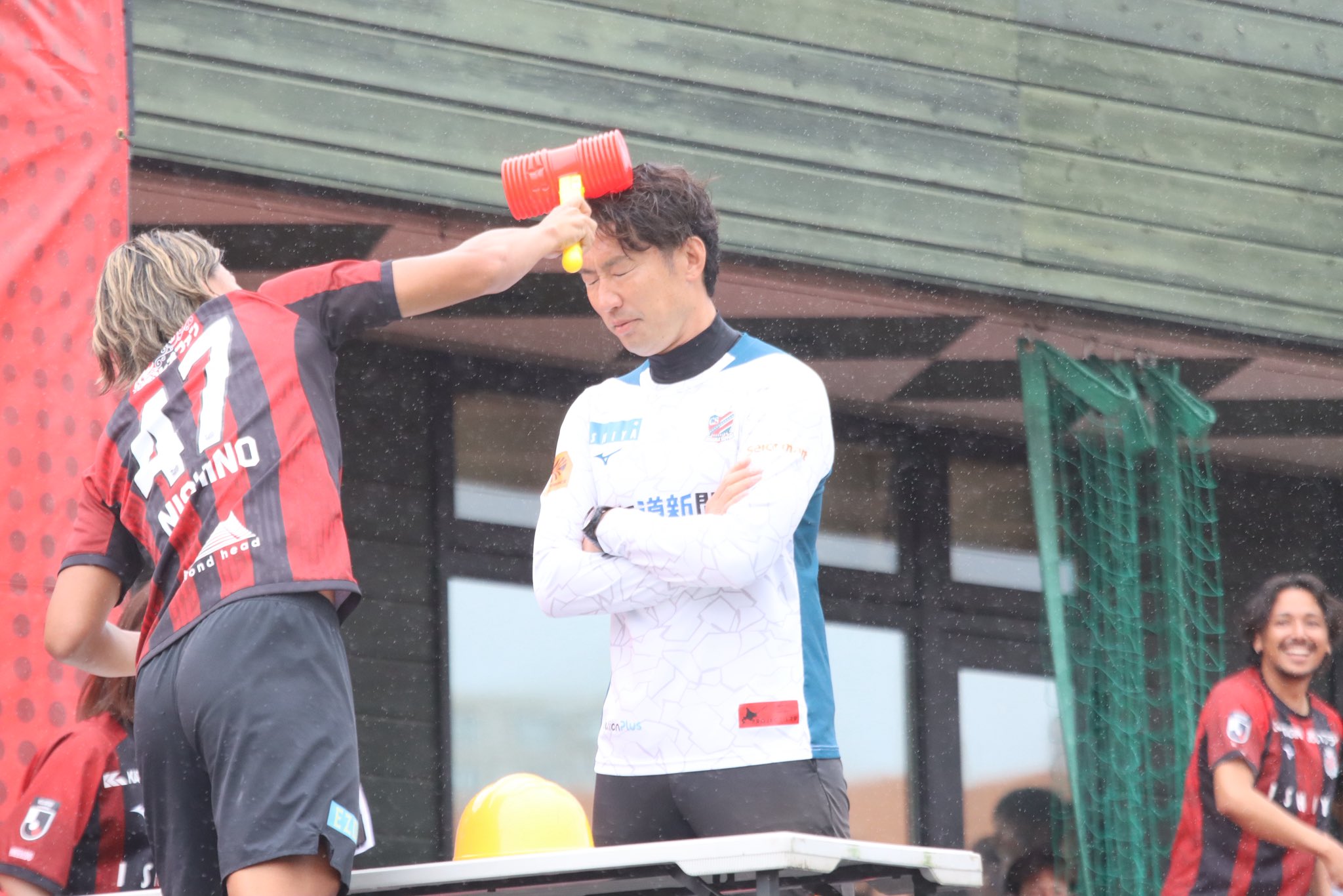 今年もサポーターズデー、お疲れ様でした!写真はイベント内のゲーム「たたいて・かぶって・ジャンケンポン」で #柴田慎吾 監督と #西野奨太 選手が対戦した場面です。アカデミー時代から師弟関係の2人。この後監督は西野選手を次節メンバーから外すと宣言し、会場を盛り上げていました🤭#consadole