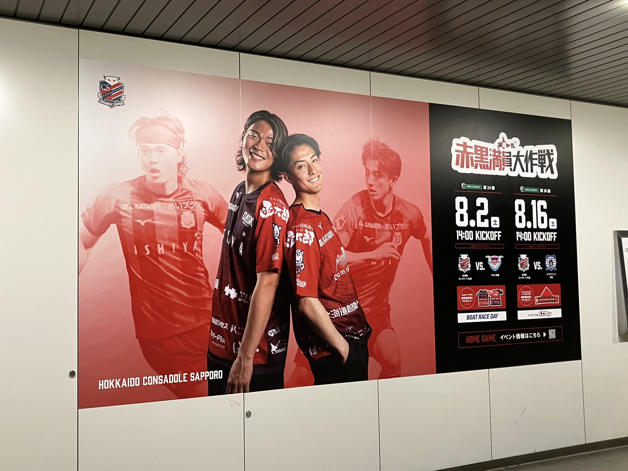 8/2(土)鳥栖戦&8/16(土)秋田戦は 🔥🟥#赤黒満員大作戦⬛️🔥 コンサドーレの2大イケメン #田中宏武 選手 #西野奨太 選手 の巨大広告が登場❤️🖤 期間:7月28日(月)~8月16日(日) 場所:地下鉄大通駅南改札口、10番出口付近