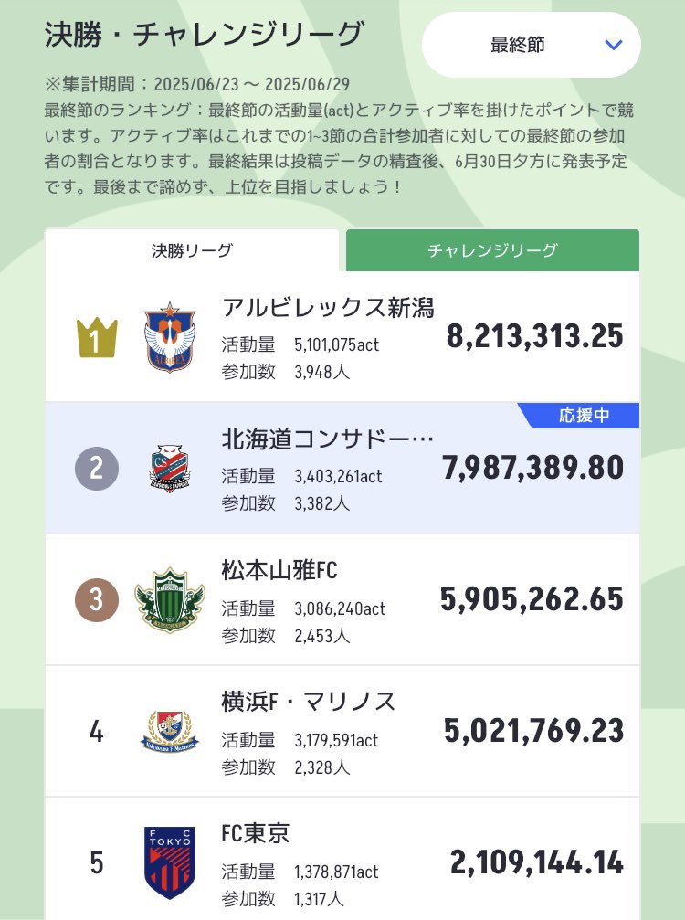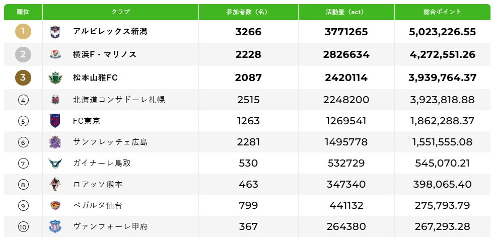 今日の大きなサプライズは松本山雅FCと北海道コンサドーレ札幌が一気に参加者を増やして活動量を大きく伸ばしてきました。両クラブ共に800名近い参加者増。両クラブのファン・サポーターの発信も一気に活気づいています。このまま両クラブで一気に2位横浜F・マリノスを追い抜く勢いです。