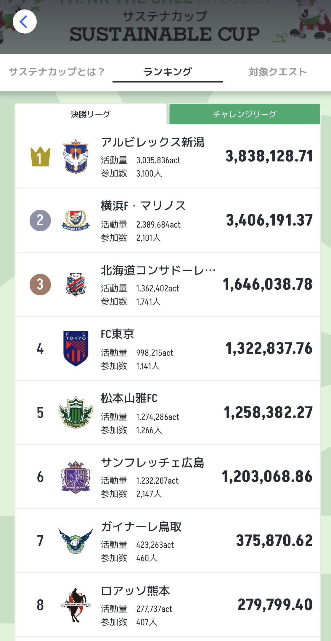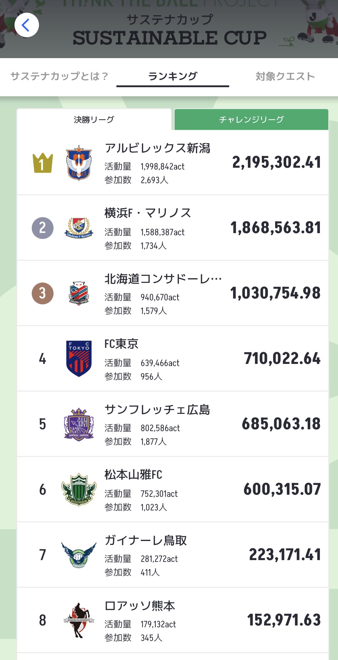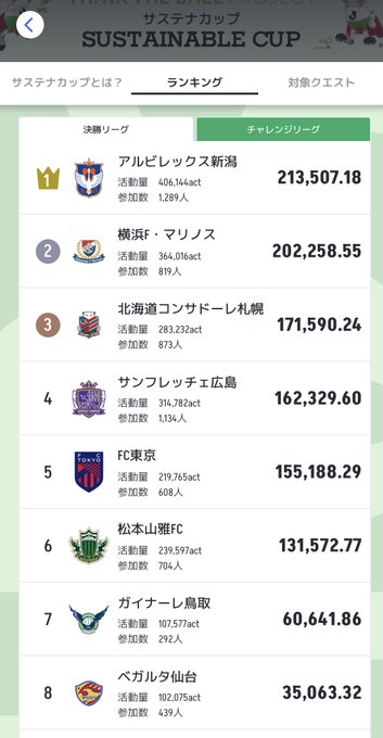 1位:アルビレックス新潟 (1)→ 2位:横浜F・マリノス (2)→ 3位:北海道コンサドーレ札幌 (3)→ 4位:FC東京 (5)↑ 5位:サンフレッチェ広島 (4)↓ 6位:松本山雅FC (6)→ 7位:ガイナーレ鳥取 (7)→ 8位:ロアッソ熊本 (9)↑ 9位:ベガルタ仙台 (8)↓ 10位:ヴァンフォーレ甲府 (12)↑ 決勝リーグ2日目。昨夜から今朝にかけて、横浜F・マリノスが逆転首位となったものの、アルビレックス新潟ファン・サポーターの呼びかけに同志たちが集まり参加者急増で再度首位に返り咲きました。 両クラブファン・サポーターの皆様の声の掛け合い、フォローし合う一体感に驚嘆しております。上位4クラブは既に2日でアクティブ率が100%を超えています。
